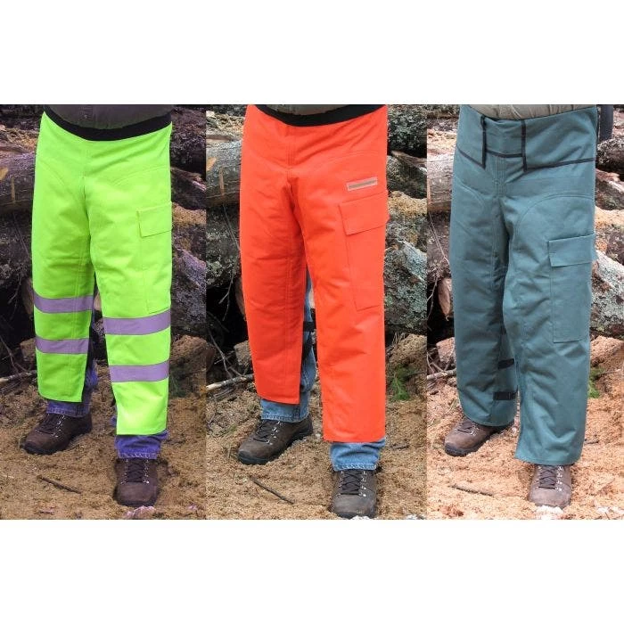 Oil and water resistant oxford outer. Choose from Safety Green chaps featuring 2in wide reflective stripes, or from Forest Green or Safety Orange. Waist is adjustable from 26″ to 46″. Length is measured from the waist, not the inseam. All chaps include a side pocket. Wash by hand in cold water, hang dry.