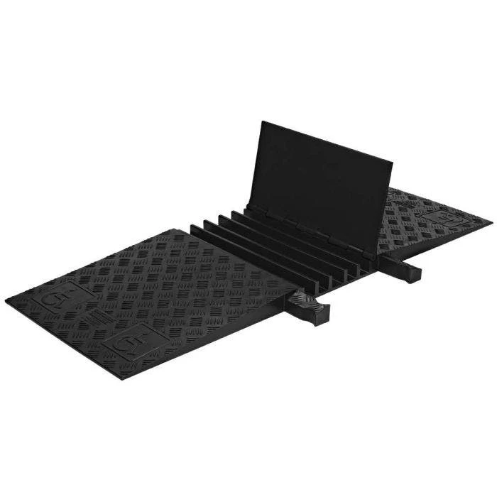 These Guard Dog® Cable and Hose Protectors have built-in ADA-compliant accessibility ramps. Each ramp features five 1-3/8-inch by 1-5/16-inch channels and supports loads up to 21,000 pounds per axle! Each section has recessed handles for easy carrying. Choose your desired color pattern below. Guard Dog® Cable and Hose Protectors are ideal for providing a safe crossing for vehicles and pedestrians in high-traffic areas. They are great for greenhouse growing, field production, worksite safety, and public works application. Their channel diameter makes them perfect for protecting most 5/8 and 3/4-inch hoses. Guard Dog’s® patented 5-bar tread surface maximizes traction to prevent slips or trips. A unique dog bone style connector allows you to link multiple protectors with ease. Guard Dog® created these ramps to protect your expensive hoses and cables from damage and protect others from trips and falls. The ADA-compliant ramps allow wheelchairs and other mobility devices to safely cross over hazards.