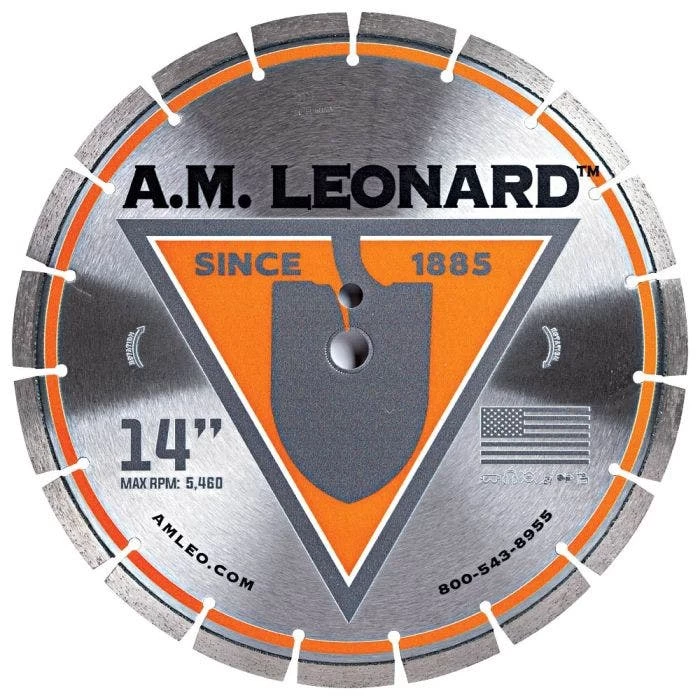 The Leonard General Purpose Diamond Blade features dense, diamond segments. This blade measures 14 inches in diameter and has a 20-millimeter (1-inch) knock out arbor. This blade withstands up to 5,460 RPMs.