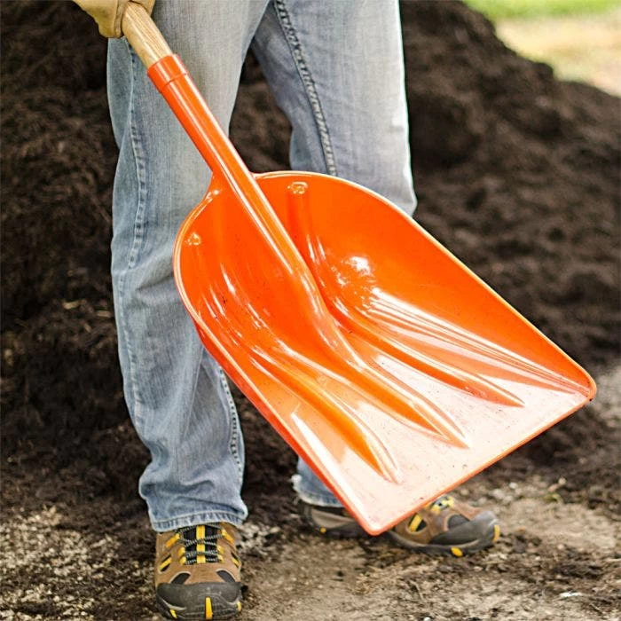 The #12 size blade quickly moves large volumes of mulch, seeds, grains, fertilizers and similar materials, while also being very useful for cleanup and snow removal. 14-1/2″ wide blade and American Ash handle with poly D-grip. 47″ overall length. Wt 3.95 lb.