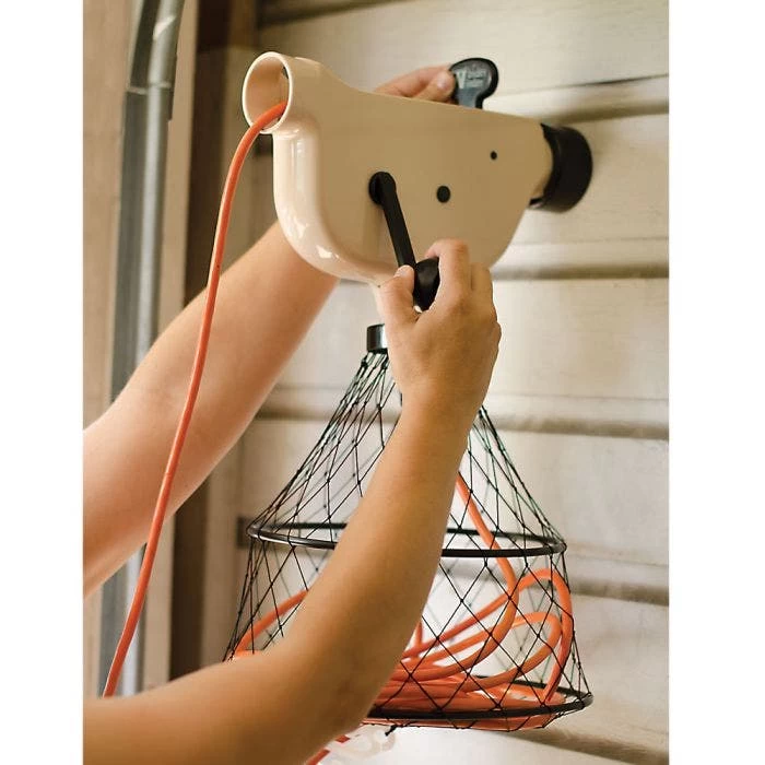 - Mounts to the wall with swivel plate. Plug your cord into the nearest outlet from the bottom of the basket and feed it through the unit by simply pulling it, Pushing the rewind button and cranking the handle winds it up again